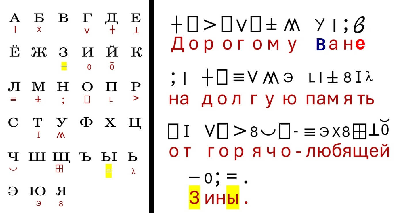 Но оставалась одна заминка. Мне было непонятно, почему я не нахожу в своем подстановочном алфавите соответствия для последней буквы (написанной как прописная «в») в имени «Ване» в первой строке. Для буквы «е» уже был известен подстановочный знак — он был как перевернутая «T». Ох уж эта инженерная подготовка. Догадались в чём было дело?