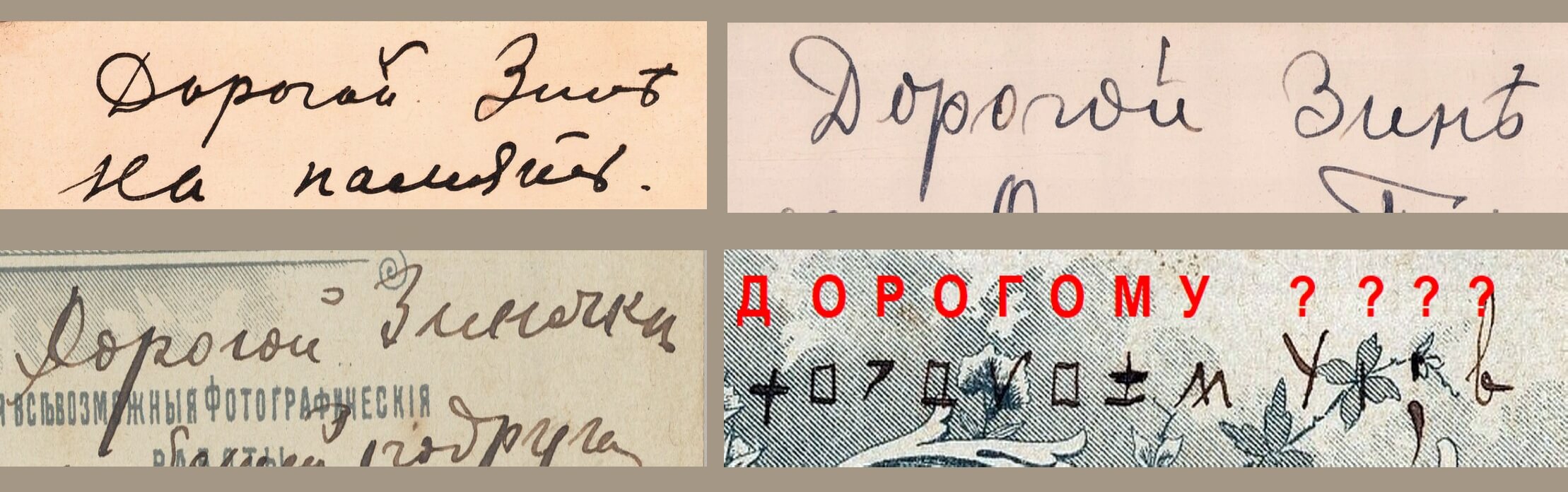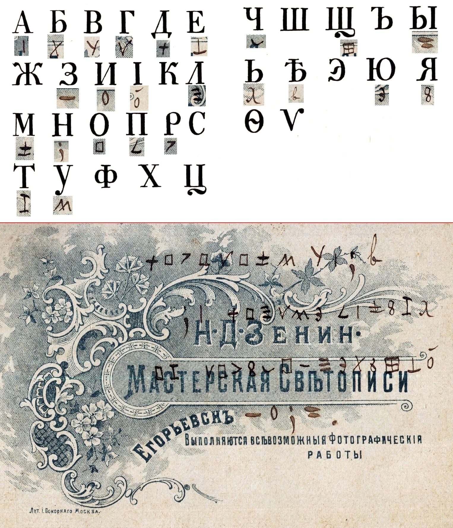 Родословные поиски почти всегда связаны с факультативными находками и приобретением забавных, но ненужных знаний. В поисках по Егорьевску, наткнулся на сайт http://wnzenin.ru, посвященный Зенину Н.Д. деятелю старообрядческого движения и по совместительству фотографу. В галерее его студийных фотографий меня ждала забавная находка — открытка с зашифрованным посланием (http://wnzenin.ru/wp-content/gallery/07/07-14.jpg). Вот история того, как оно было дешифровано.