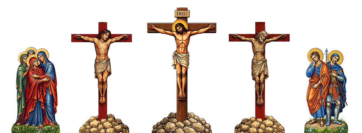 на вершине Голгофы — Иисус Христос, по бокам от него Благоразумный разбойник и Безумный разбойник;