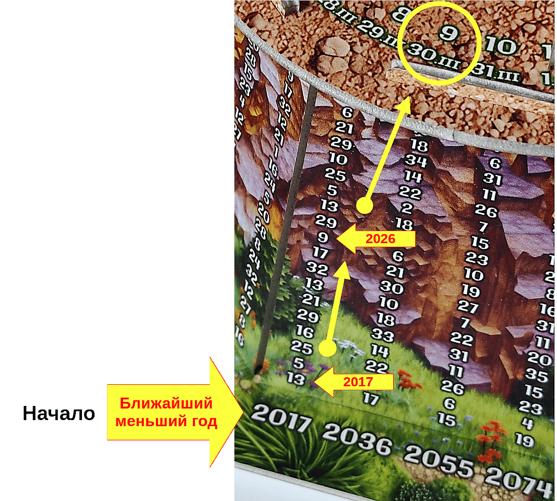 подняться по столбцу чисел на склоне холма отсчитывая годы по возрастанию — нижнее число соответствует году на круге индиктиона;