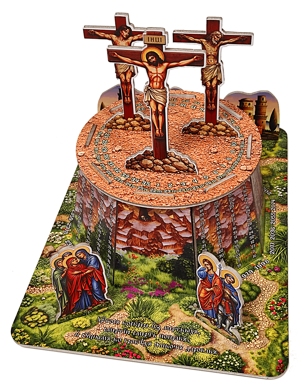 После того как я разобрался в базовых «календарных» возможностях схемы Великого миротворного круга А.Н. Зелинского, у меня возникла идея оммажа — захотелось представить небольшую «цитату» из схемы в трехмерном виде. Так родился образ «Голгофы» — 3D-композиции, обладающей, кроме прочего, функциями вечного (почти) пасхального календаря.