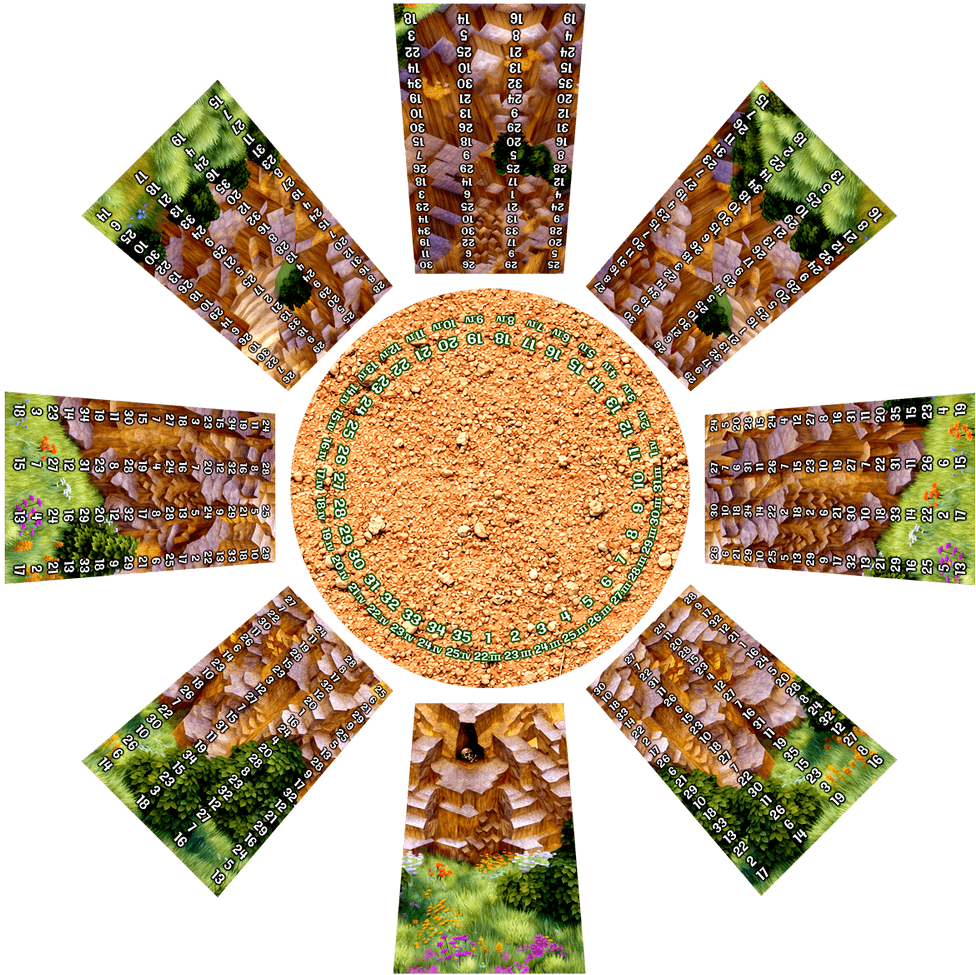 Далее, не без помощи новомодных нейронных сетей я сгенерировал «текстуры», которые были применены к основанию холма, склону и вершине. На основание холма был нанесен упрощенный круг индиктиона, детали-склоны были наполнены числами — лучами 19-летий, на вершине разместился круг пасхальных дат (в терминологии вышеупомянутой статьи).