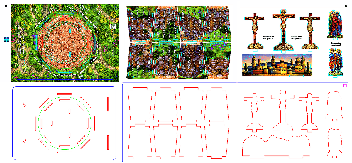 Реализация напоминает известные «конструкторы из картона без клея», где целостность обеспечивается использованием «шипов» и «пазов». Используя CAD я спроектировал элементы, которые в сборе должны были образовать нечто, с достаточной степенью условности, похожее на холм — место распятия Иисуса Христа.